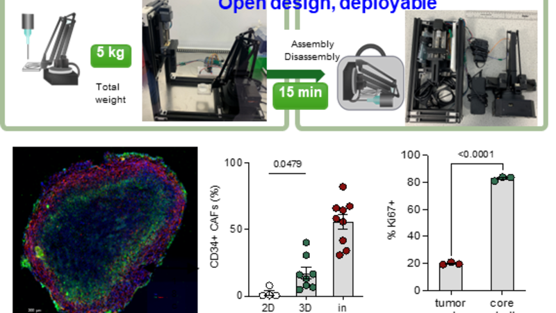 Realizing the translational impacts of three-dimensional (3D) bioprinting for cancer research necessitates innovation in bioprinting workflows which integrate affordability, user-friendliness, and biological relevance. Herein, we demonstrate 'BioArm', a simple, yet highly effective extrusion bioprinting platform, which can be folded into a carry-on pack, and rapidly deployed between bio-facilities. BioArm enabled the reconstruction of compartmental tumoroids with cancer-associated fibroblasts (CAFs), forming the shell of each tumoroid. The 3D printed core–shell tumoroids showed de novo synthesized extracellular matrices, and enhanced cellular proliferation compared to the tumour alone 3D printed spheroid culture. Further, the in vivo phenotypes of CAFs normally lost after conventional 2D co-culture re-emerged in the bioprinted model. Embedding the 3D printed tumoroids in an immune cell-laden collagen matrix permitted tracking of the interaction between immune cells and tumoroids, and subsequent simulated immunotherapy treatments. Our deployable extrusion bioprinting workflow could significantly widen the accessibility of 3D bioprinting for replicating multi-compartmental architectures of tumour microenvironment, and for developing strategies in cancer drug testing in the future.