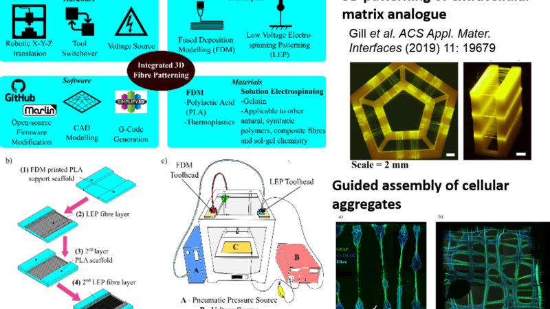 We are developing low waste, direct-write fibre technology to pattern bioactive, biocompatible fibrils, gels and sensing elements. Ultimately, the biomimetic construct will provide the building blocks for tissue regeneration. These soft electronic systems could also see a wide range of applications where electrical stimuli are required to deliver to the cellular system, a good example being the neural electrode. The development of this biofabrication technology will require in-depth understanding of the electrodyanmics of jet formation, precision instrumentation, and innovative materials processing.