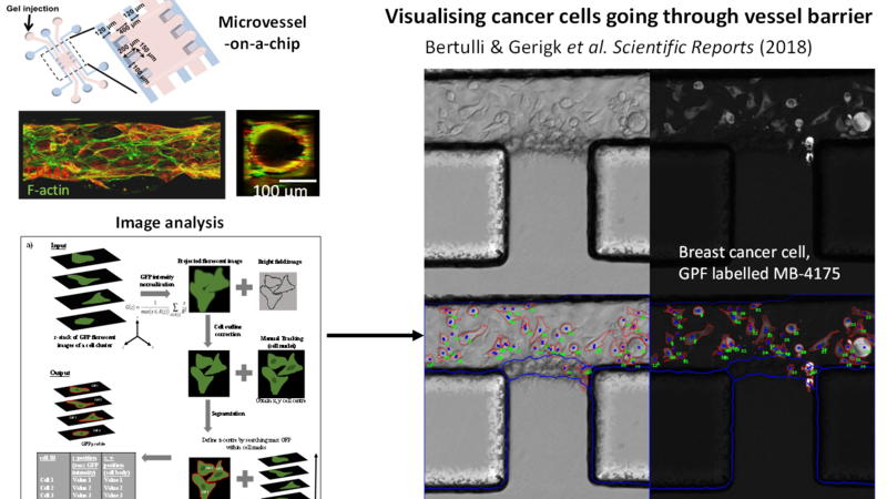 This research area focuses on developing models to recapitulate the microvasculature, and other key microenvironment factors for living cells in a fluidic device. Specifically, we apply our materials approach to study the motility of cancer cells when they interact with a vessel formed by the endothelial cells, to mimic the conditions of cancer invasion. We have also created a glomerulus-on-a-chip, for industry-relevant drug testing of kidney disease.
